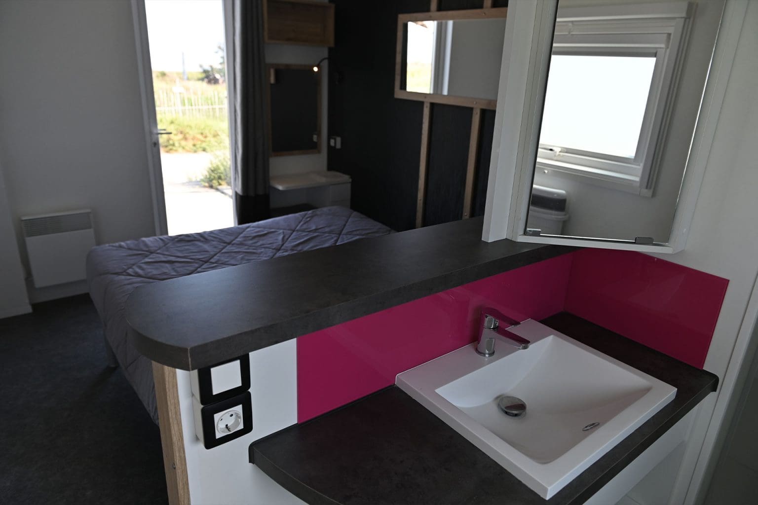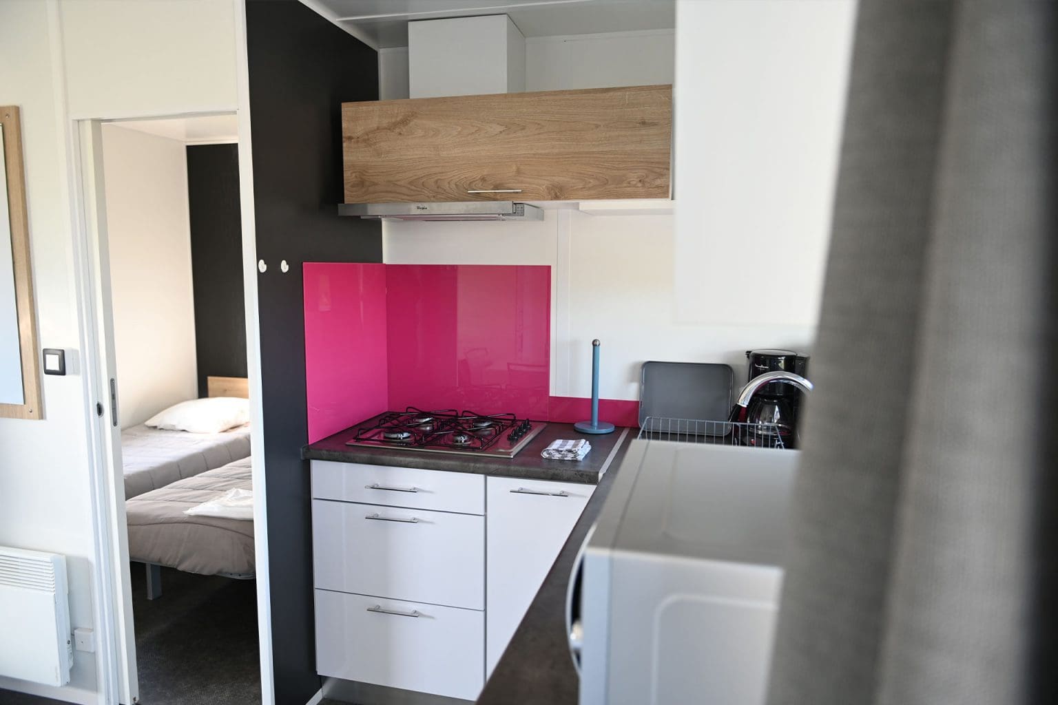 Das Mobil-Home Taos f4 Küche hat eine Gesamtfläche von 38 m2, mit einer Deckenhöhe von 3m70, verteilt auf zwei Schlafzimmer, ein Wohnzimmer, eine ausgestattete Küche, zwei Badezimmer und zwei WCs, davon eines separat, in erster Reihe gelegen mit Blick auf die Salzgärten von Salin de Giraud.