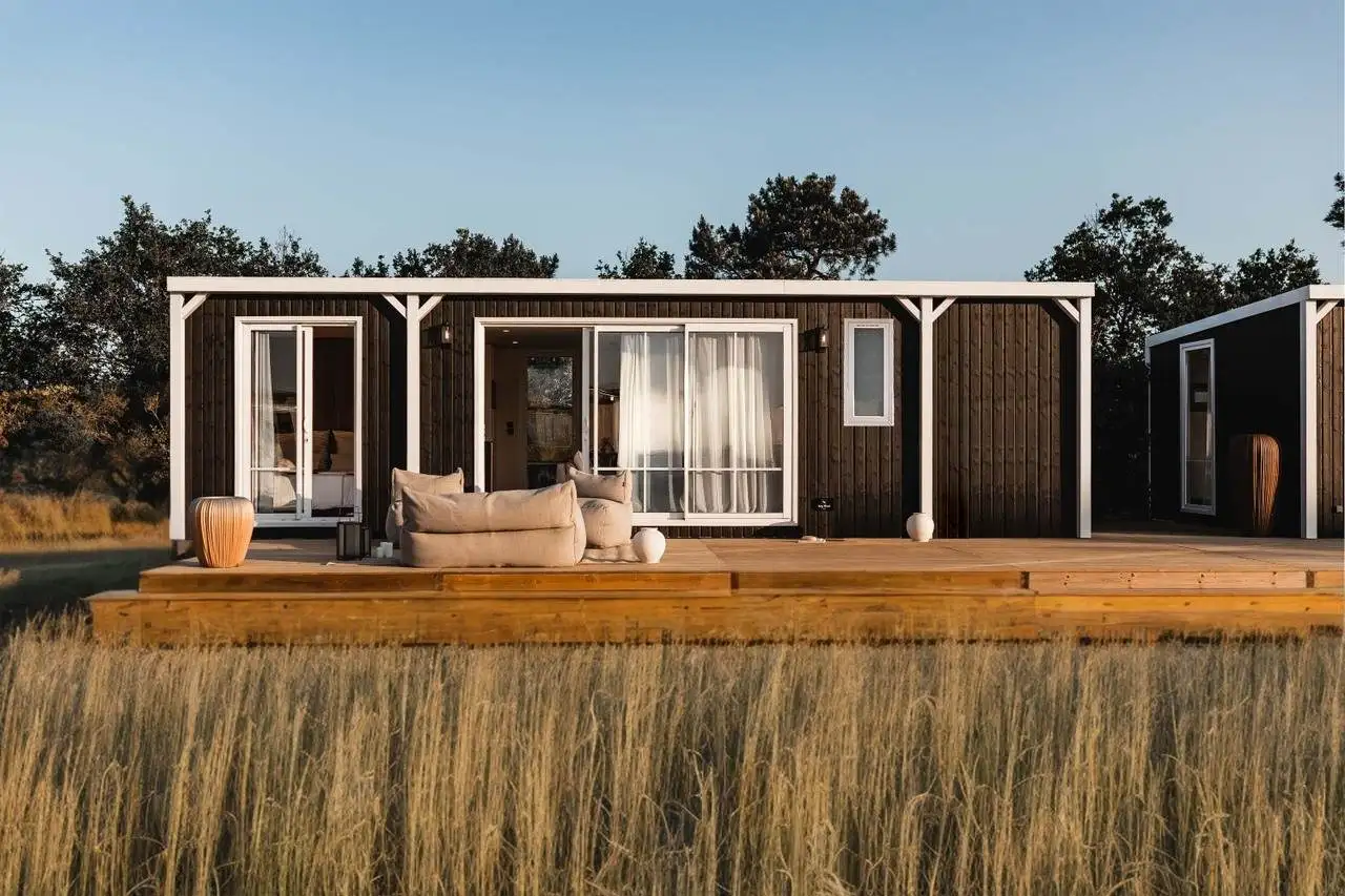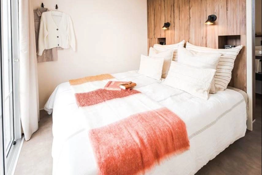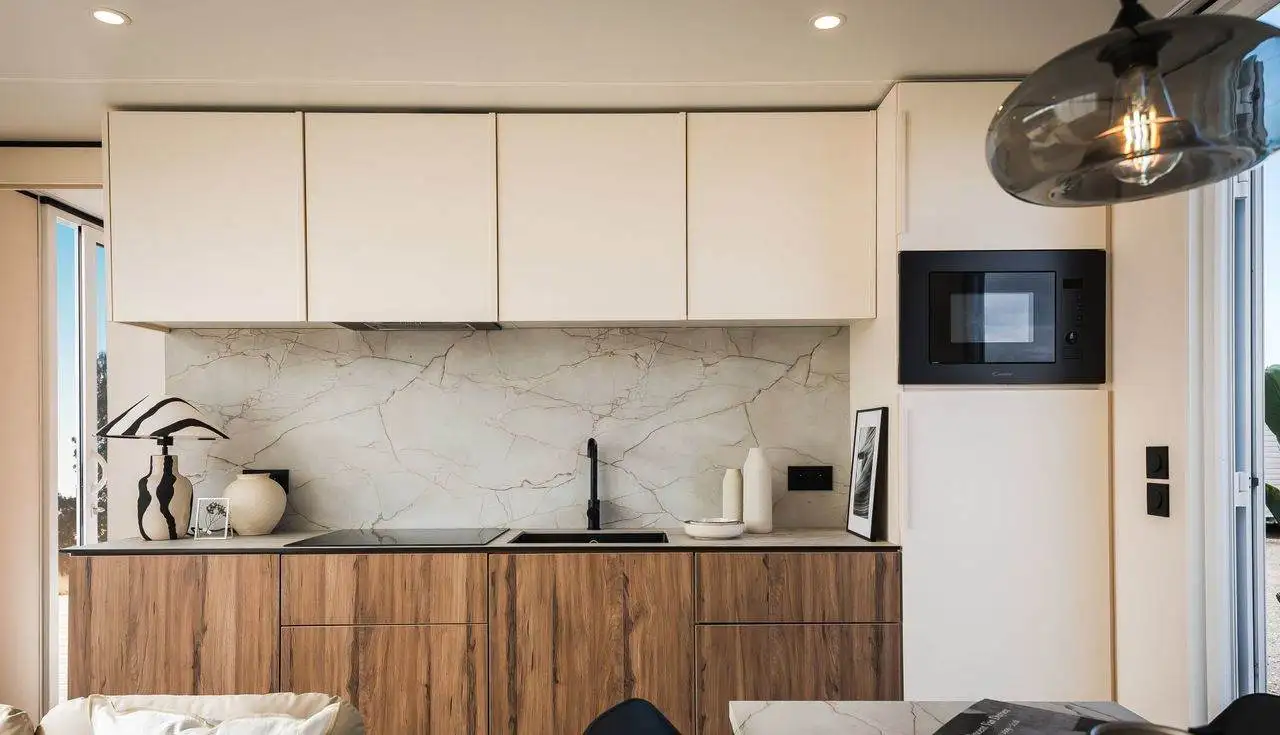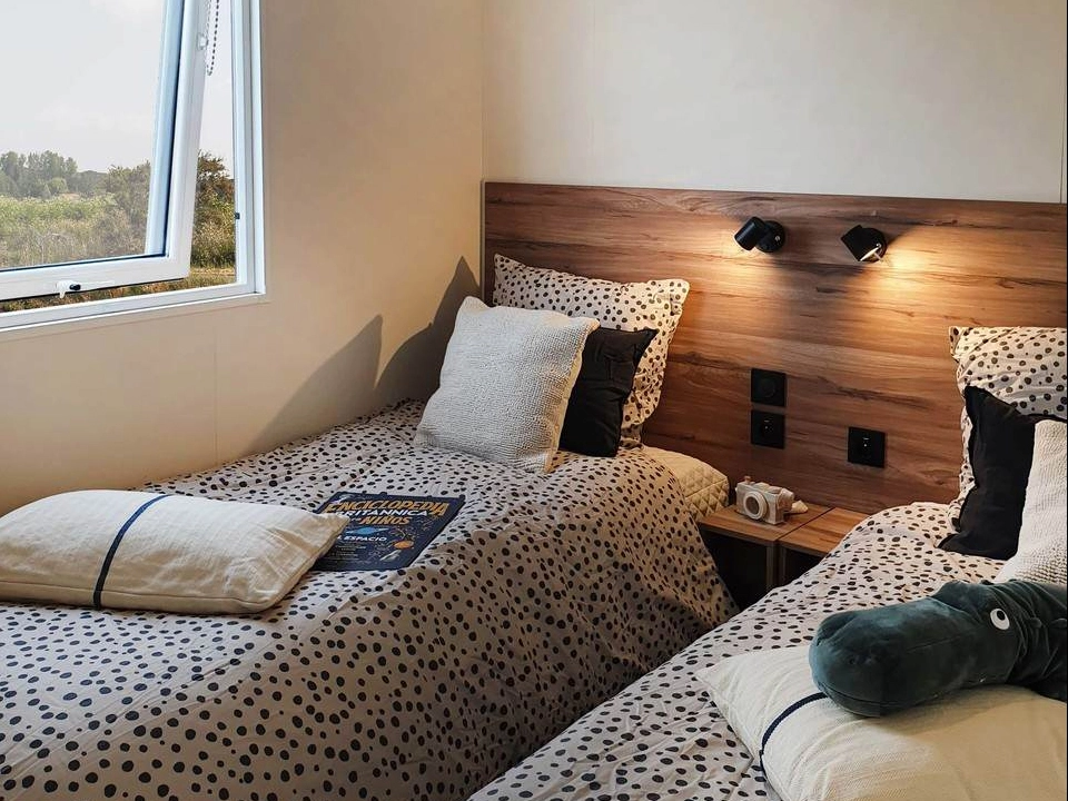 Our brand-new Key West 2026 mobile home, with a surface area of 40 m², features two bedrooms, a living room with an open-plan fully equipped kitchen, two shower rooms, and two toilets, one of which is separate.